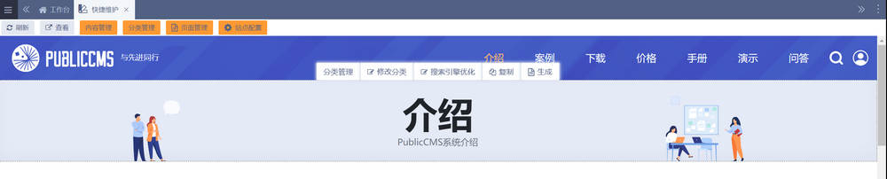 进入管理后台后,点击快捷维护,进入页面快捷维护模式,查看页面的同时,上方菜单可以动态展示相关功能菜单,鼠标滑过页面元素可以动态显示快捷功能按钮