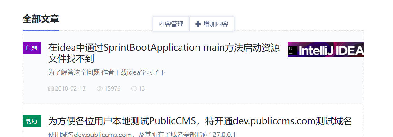publiccms功能日益复杂,菜单项越来越多,对于不熟悉的用户,找的自己想要的功能成了一件比较痛苦的事情,为此我们开发了数据快捷维护的功能,此功能将在包含在下个版本中,也可以在源码开发分支体验,目前已经在官网更新,可以提前体验