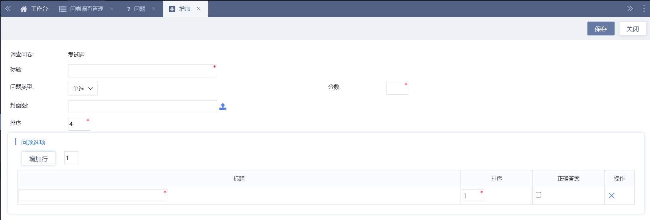 点击增加按钮可以新增问卷调查,问卷调查类型目前有问卷调查、试题两种