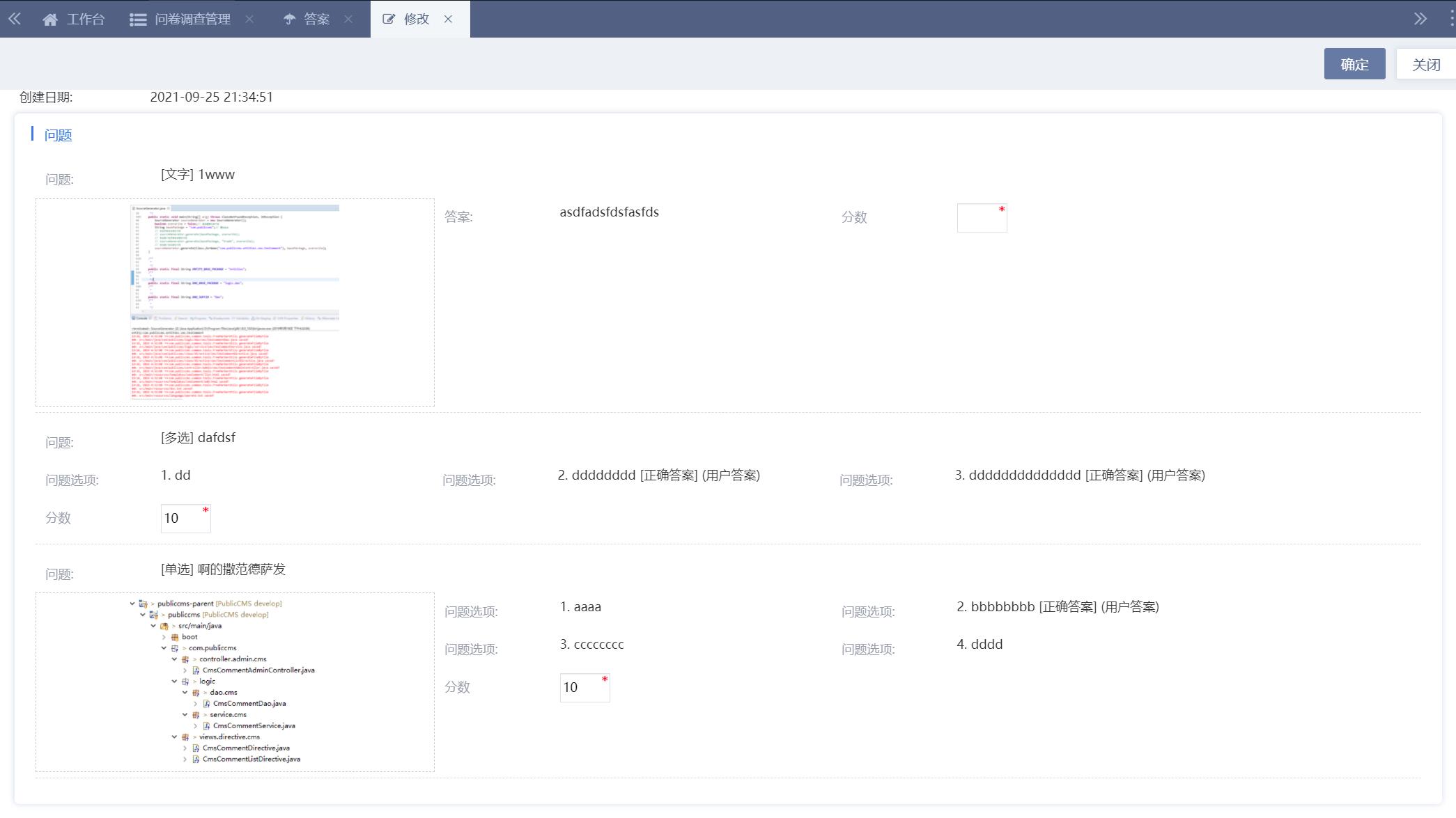 点击问卷标题可以查看问卷的问题列表,及用户调查汇总(*单选、多选、下拉框)如果是实体类型还会标识正确答案
