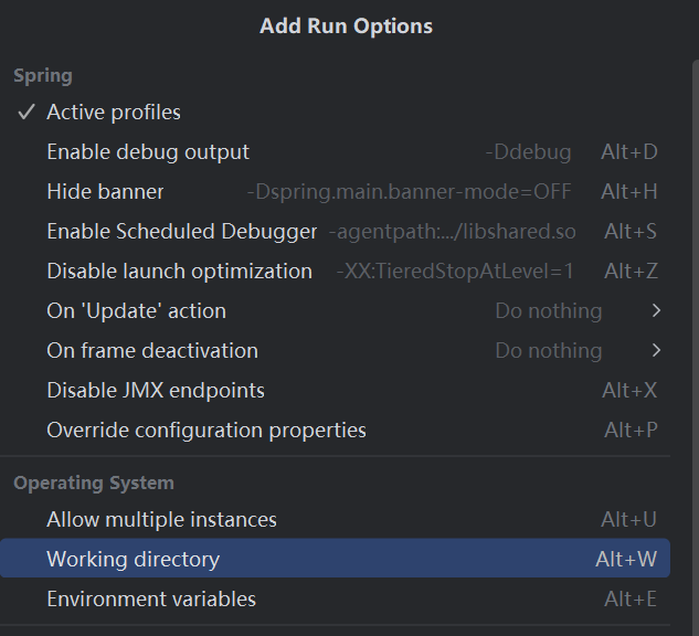 在Run菜单 找到 Edit Configurations菜单项,点击Modify options打开配置项选择列表,找到并点击Working directory