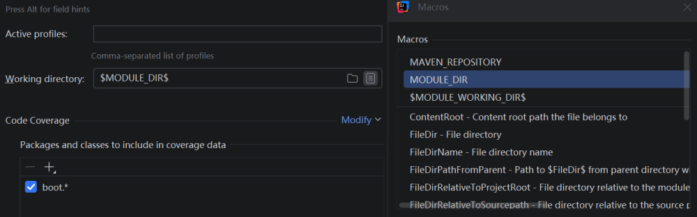 选择最右侧Macros,选择MODULE_DIR或者选择publiccms 模块所在的物理路径