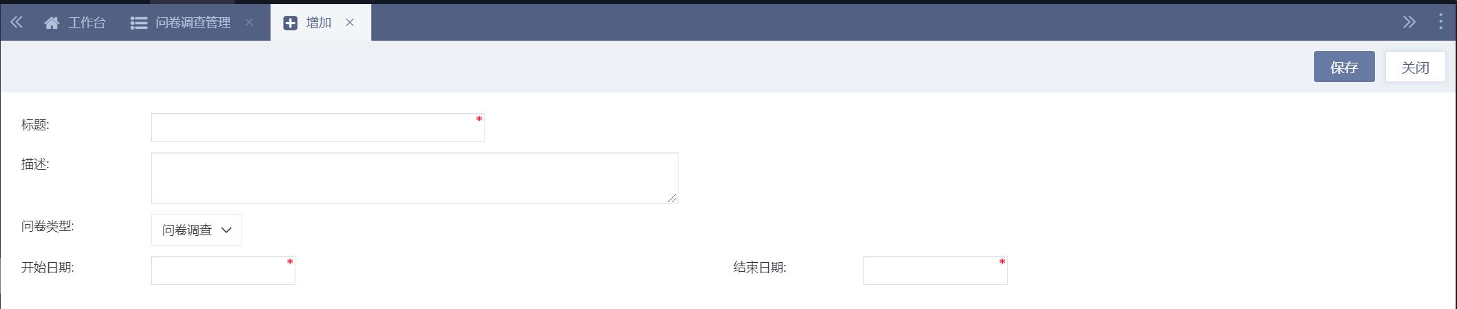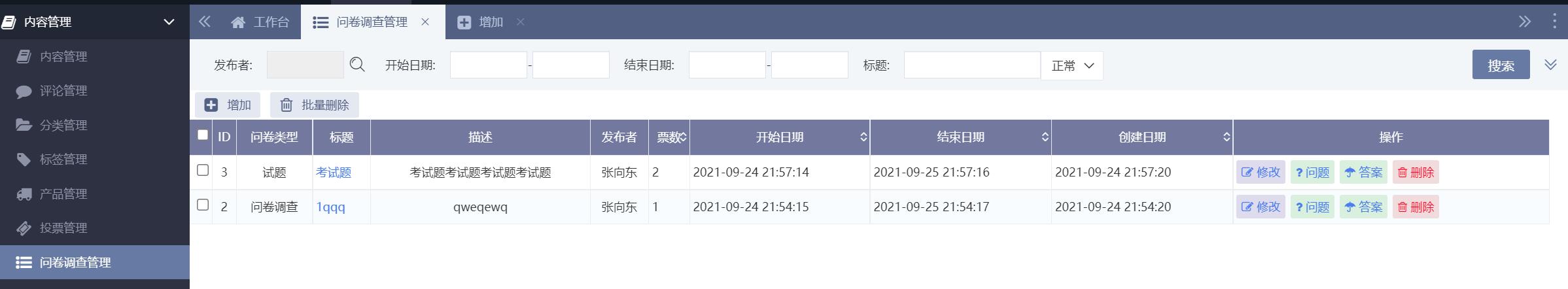 点击增加按钮可以新增问卷调查,问卷调查类型目前有问卷调查、试题两种