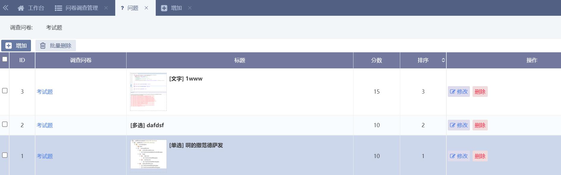 在问卷调查列表点击问题可以查看问题列表,点击增加按钮可以增加问题